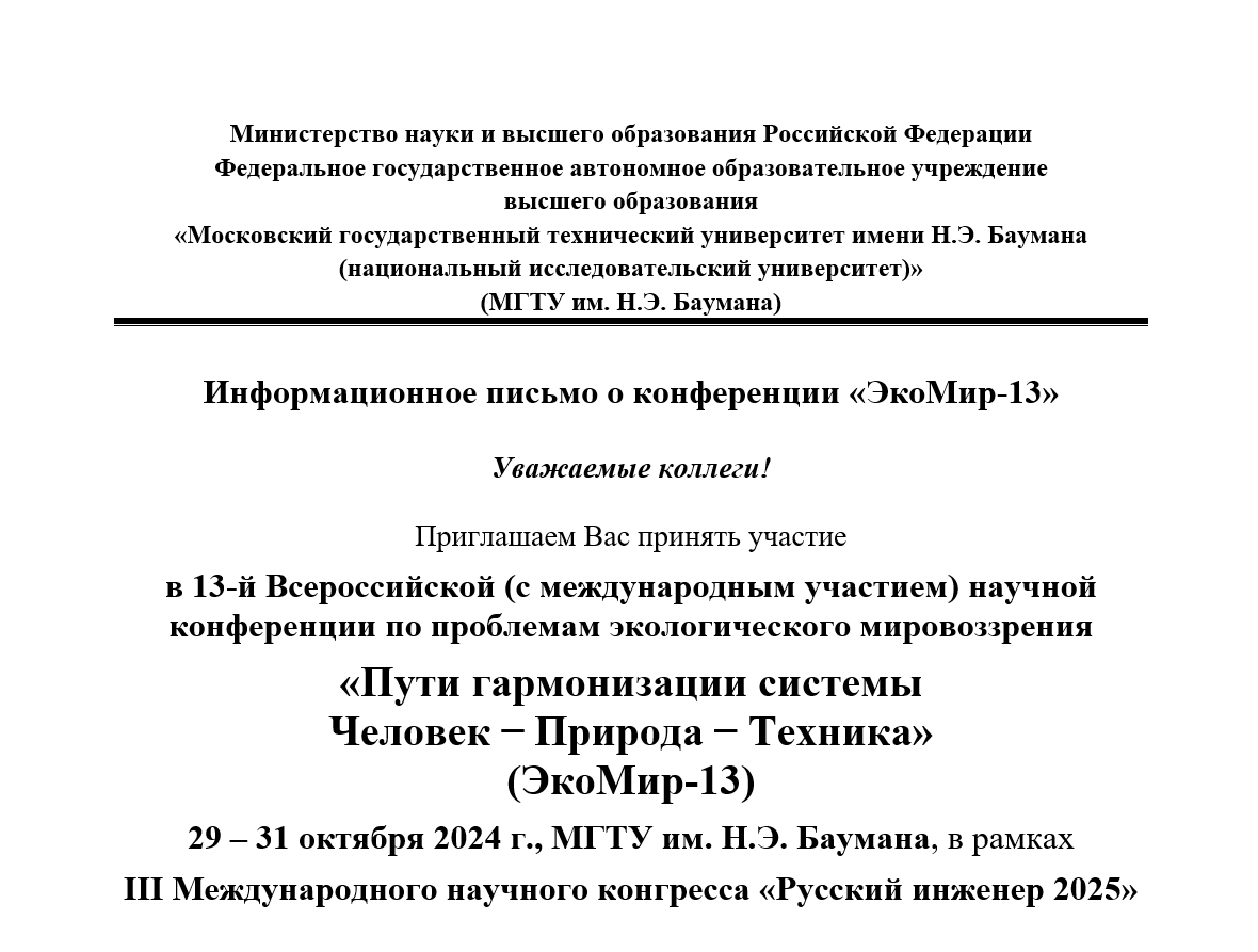 Основные информационные материалы и документы Научного конгресса «Русский инженер 2025», в т.ч. конференции «ЭкоМир-13», размещаются на сайте Конгресса и на сайте МФ МГТУ им. Н. Э. Баумана.