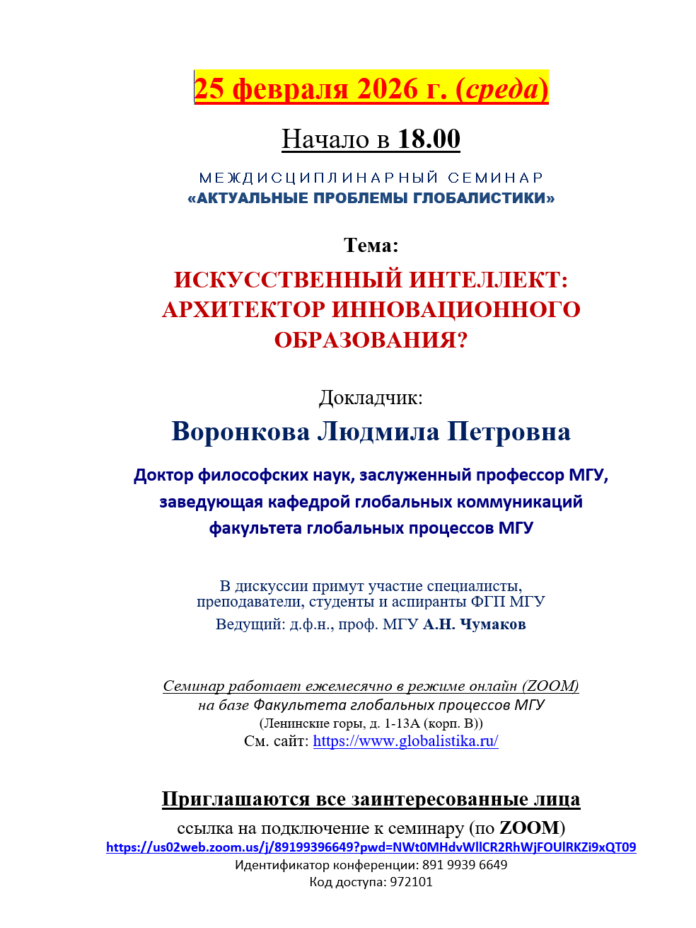 25 февраля 2026 года (среда) в 18:00 (МСК) состоится междисциплинарный семинар «Актуальные проблемы глобалистики», который проходит ежемесячно в онлайн-формате (Zoom) на базе Факультета глобальных процессов МГУ имени М. В. Ломоносова.